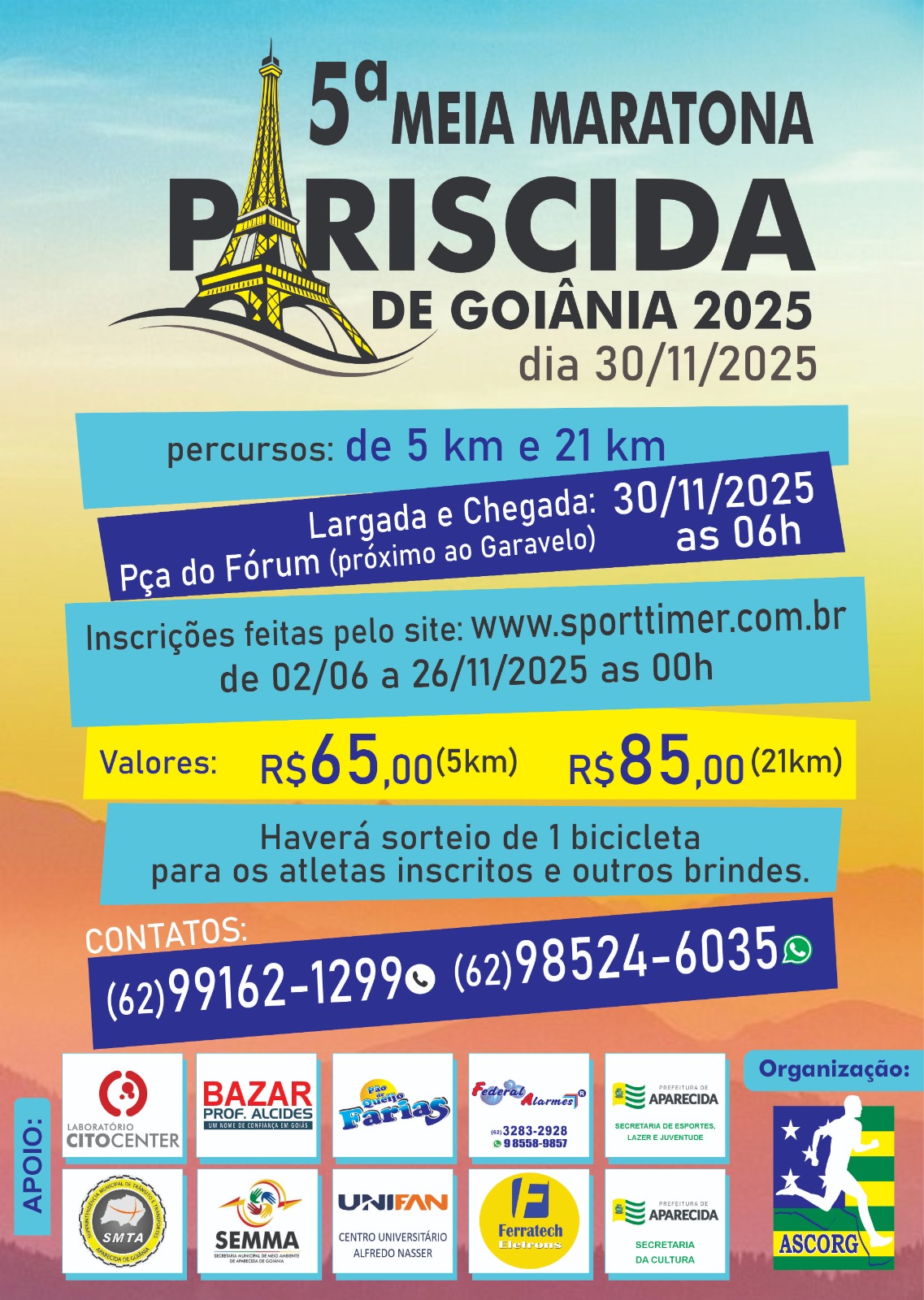 Está organizando a 5ª Meia-Maratona Aparecida de Goiânia com percurso de 21km e 5km, que será realizada 30 de novembro de 2025, com largada e chegada prevista para as 06 horas da manhã na Praça do Fórum de Aparecida de Goiânia ao lado da Avenida Central, próximo ao Garavelo.